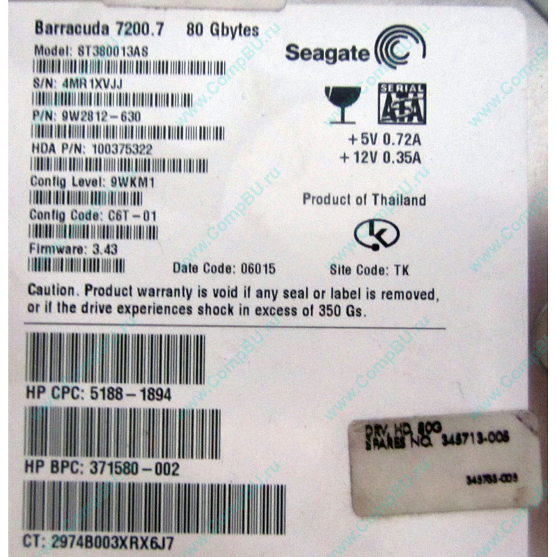 БУ жёсткий диск 80Gb Seagate Barracuda 7200.7 ST380013AS (80 гигабайт, 7200 rpm) SATA (HP 345733-005, spare no. 345713-005). Можно устанавливать не только в компьютеры HP.